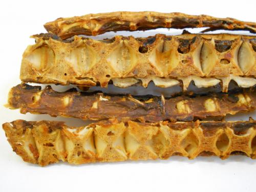 まぐろの中骨を半割にしてジャーキーに仕上げました。まさにシンプルイズベスト!多少の身の部分も残して仕上げてあります。