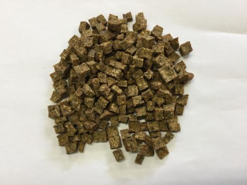 北海道産のサーモンの皮、身、骨、内臓をミンチ後ダイス状に形成しました。